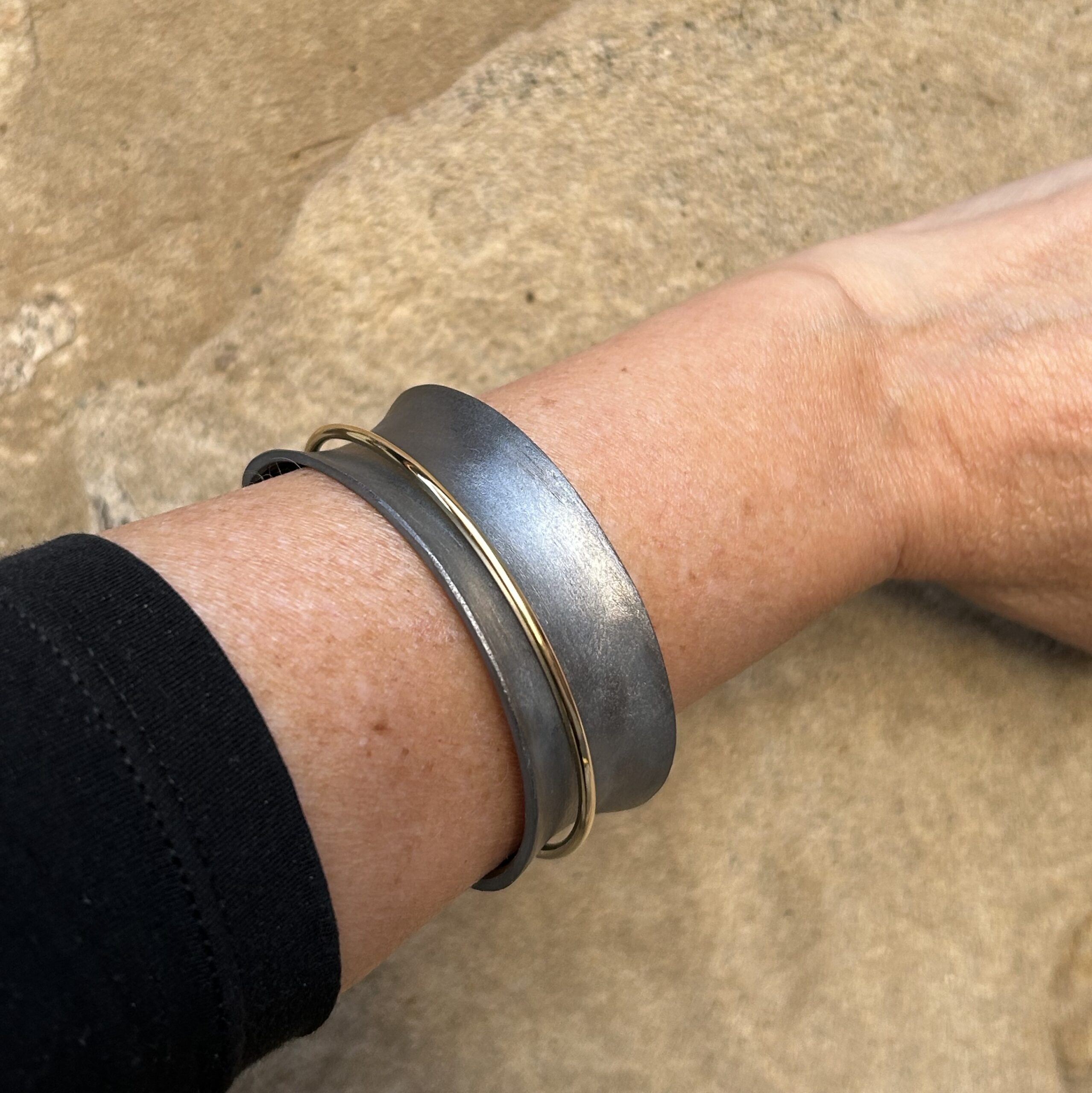 Brazalete de plata oxidada y charnela de oro pulido